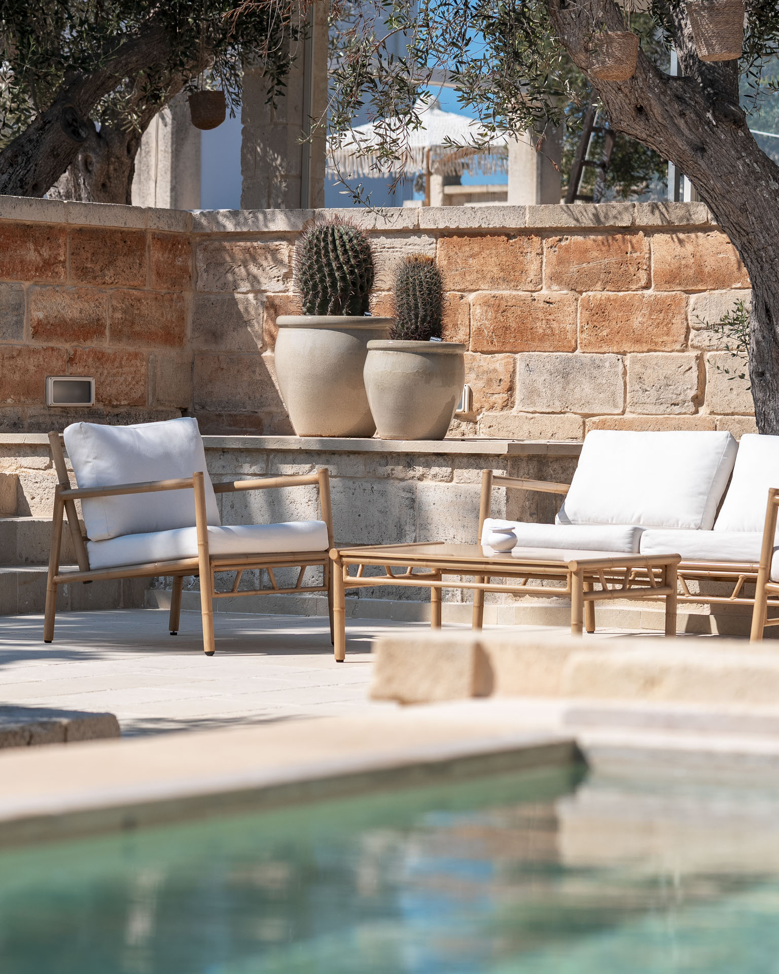 All’interno della masseria, due piscine immerse nel verde offrono spazi pensati per vivere il relax. La piscina principale, ampia e lineare, è incorniciata dalla pietra chiara e da lettini affacciati sull’acqua turchese, in armonia con l’architettura e la natura mediterranea.